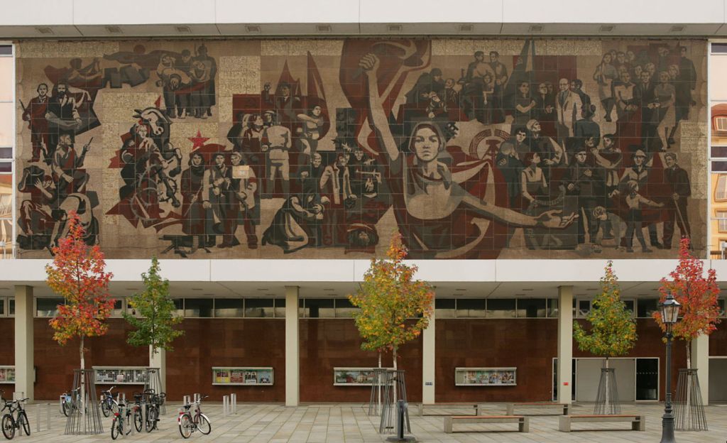 Diese Bedeutung wurde dem Kulturpalast nicht immer und nicht von jedem zugemessen. Nach der Wende forderten einige Traditionalist*innen sogar seinen Abriss, um dort in Anlehnung an den Dresdner Altmarkt eine „authentische“ Rekonstruktion des ehemaligen barocken Stadtbildes entstehen zu lassen. Dieser Forderung wurde nicht nachgegeben. Auf diese Weise konnte der Kulturpalast als ein Zeugnis des sozialistischen Städtebaus gerettet werden. Seit 2008 steht die kommunale Mehrzweckhalle sogar unter Denkmalschutz. Das sich an der Westseite des Kulturpalastes befindliche großformatige Wandbild „Der Weg der Roten Fahne“ ist bereits seit 2001 als Denkmal geschützt. Es wurde 1968/69 von Gerhard Bondzin unter Mitwirkung der Dresdner Kunsthochschule geschaffen und stellt bis heute ein nennenswertes Geschichtsdokument dar. Ein spannender Überrest aus sozialistischen Zeiten, der das damalige Geschichtsbild bis heute sichtbar werden lässt. Dargestellt im Stile des sozialistischen Realismus, zeigt das Gemälde den Weg zum Sozialismus, angefangen mit der 1848er Revolution bis hin zur Gründung der DDR. Als fester Bestandteil der Außenfassade des Kulturpalastes präsentiert sich das Wandbild, das es im Gesamtkontext des Gebäudes zu interpretieren gilt, auch heute noch trotz kontroverser Debatten stolz seinen Betrachter*innen und ist somit ein wichtiger Bestandteil des Stadtbildes – ganz anders das Gemälde in der Prager Straße, das aus dem Blick der Öffentlichkeit gedrängt wurde und sein Dasein im Dunkel einiger Häuserfronten fristet. An diesem Aspekt lässt sich abermals erkennen, dass in Dresden hinsichtlich des Umgangs mit dem sozialistischen Erbe kein einheitliches Konzept auszumachen ist.